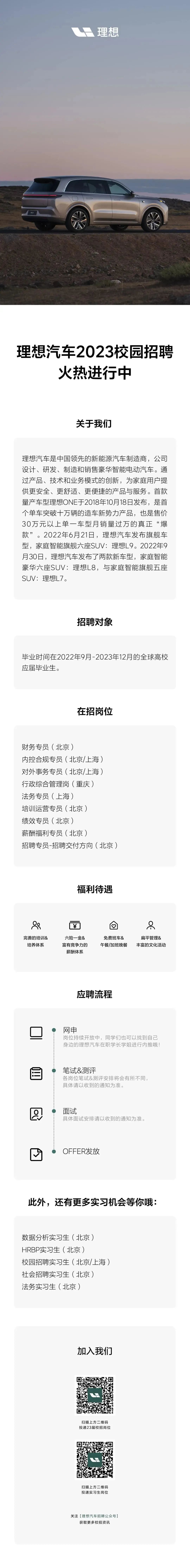理想汽车2023校园招聘火热来袭~六险一金 完善的培训体系!