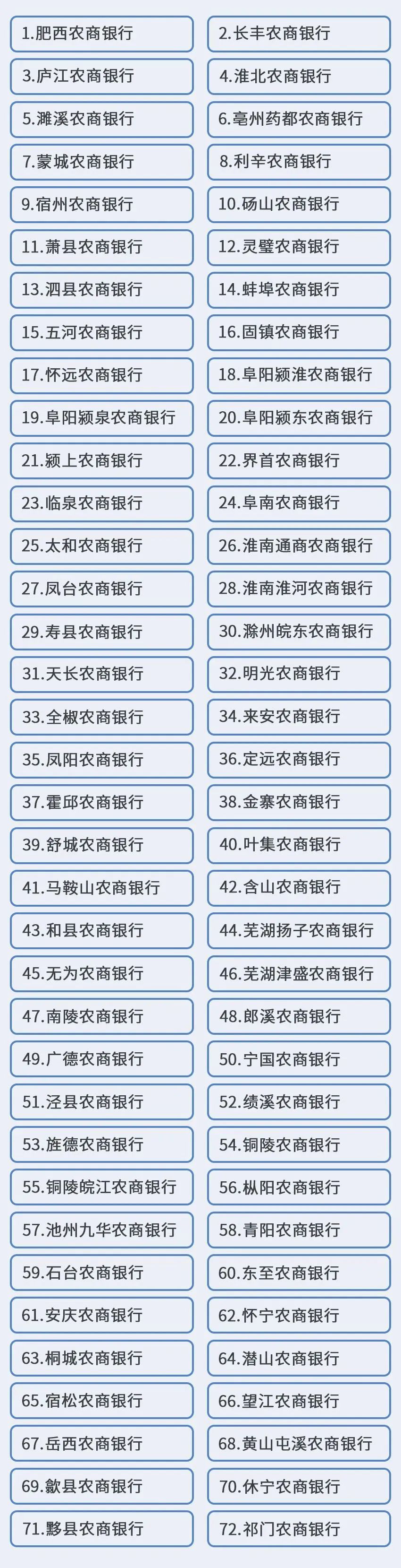 安徽全省农村商业银行根植江淮大地,经过70多年的改革发展,目前已成为省内业务规模最大、机构网点最多、覆盖范围最广、服务群体最多的银行业金融机构,存贷款市场份额,涉农、小微、县域等贷款投放量,服务网点数、服务客户数、手机银行用户数、银行卡发卡量、税收贡献度等十多项主要经营指标位居全省银行业首位。