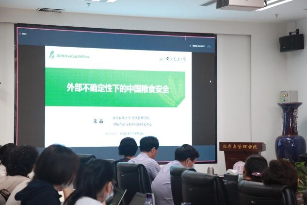 120周年校庆表示祝贺。随后,朱教授强调了国家粮食安全的重要性,并结合国内和国际现状,从我国粮食安全高安全水平、高开放水平这一新阶段和“想挡挡不住”、“想做不能做”、“想进有风险”、“想为难作为”这些新挑战展开进行了详细汇报。她以中美经贸摩擦为切入点,全面分析了外部的“不确定性”及其对中国粮食安全的影响,同时向大家分享三点应对措施:一、加征关税持续,保障中国农产品可获性;二、中美推进协议,平衡其他进口来源国利益;三、平衡重要伙伴,实行进口多元化战略。针对俄乌冲突,她也提出稳产保供、风险预警、生产补贴、农产品进口多元化、维护开放与良性的世界农产品贸易格局这几点思考建议。她表示,在此大环境下,中国同样需要加快实现国内粮食生产转型升级,加强需求侧管理。最后,赵翠萍院长以准、宽、深三字对朱教授的报告作出高度评价,现场师生踊跃提问,朱教授一一作答。