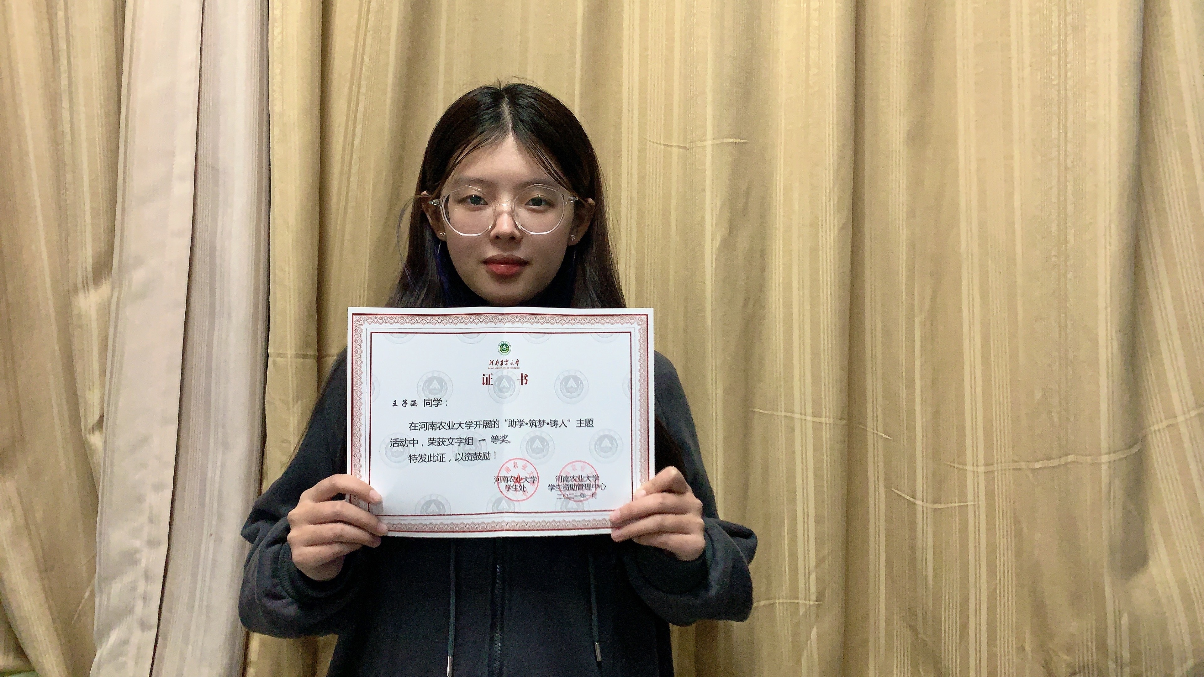 “青春是窗外的梧桐树,是骄阳,是满怀希望和梦想的少年吹的晚风。”这是她对青春的看法,这句话也一直贯穿着她大学生活的方方面面。