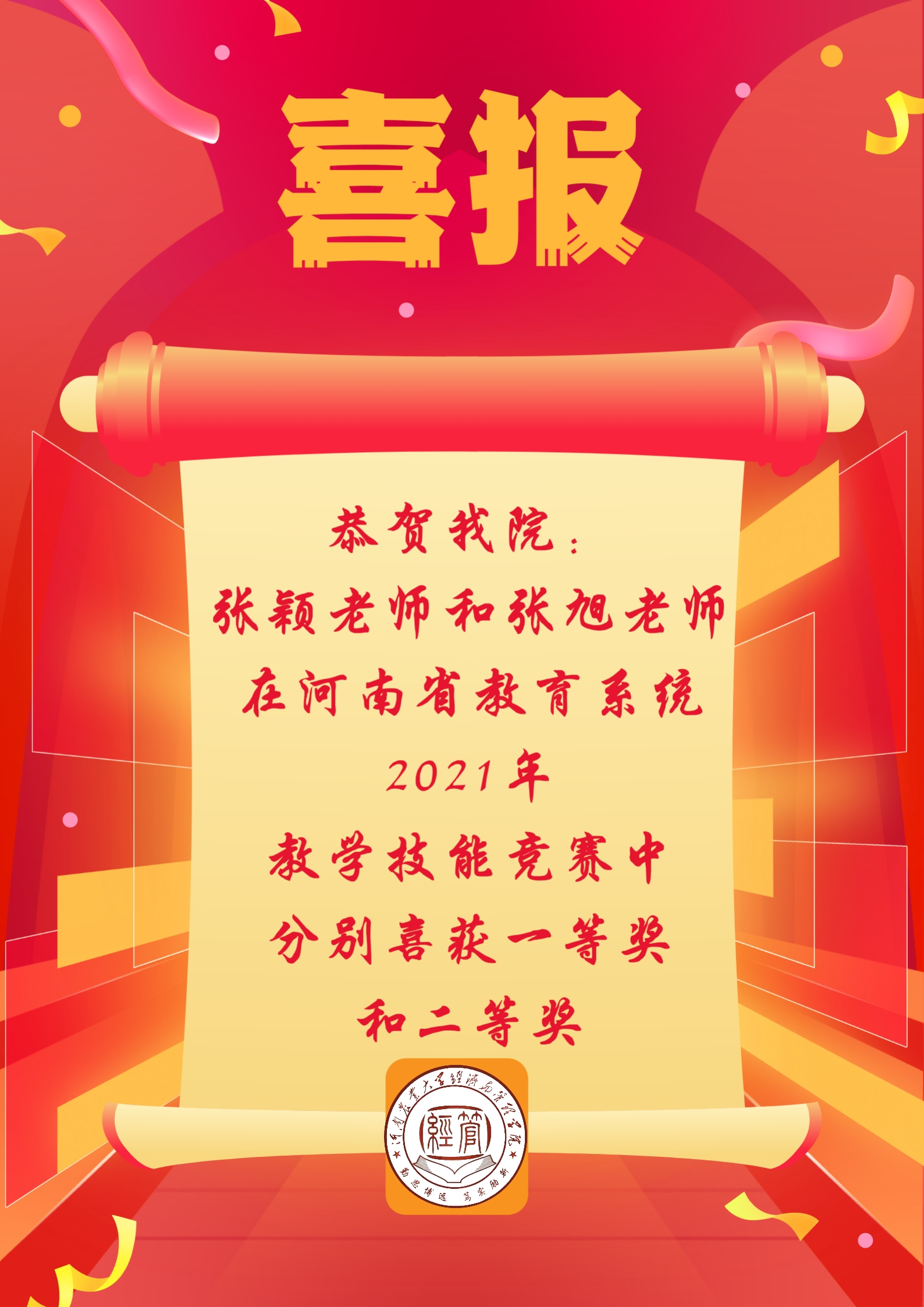 张颖老师和张旭老师凭借扎实的教学功底、独具特色的授课风格分别获得了高校经管科一等奖和二等奖的好成绩。