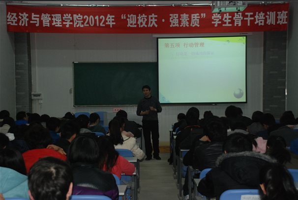 2011年学生骨干培训班在菊潭园大十教室举办题为“相约成功--成功人士的五项管理”知识讲座,此次讲座邀请院党委副书记李建群担任主讲人,团委书记郭娟、辅导员张倩及全体学生干部、学生会成员聆听了此次讲座。