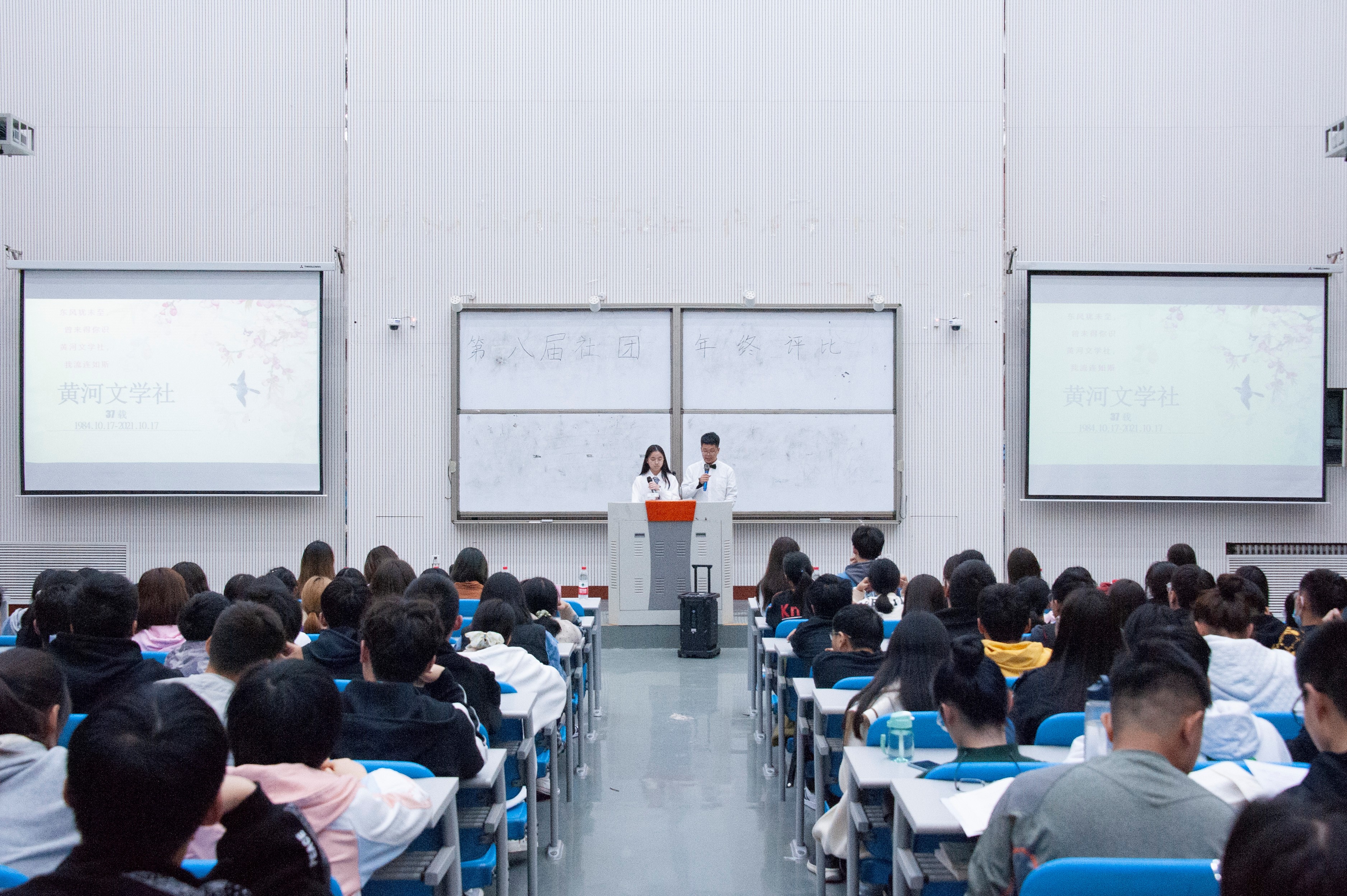 活动开始前,评委老师、各社团成员和新生依次入座。在主持人宣读了评比规则后,此次社团评比活动正式拉开了帷幕。活动伊始,社团部部长韩紫绿首先简单介绍了近来社团的发展状况,围绕工作章程、工作总结以及社会影响力等三个方面肯定了过去一年里各个社团的工作成果,同时也向大家陈述了未来一年的工作计划。