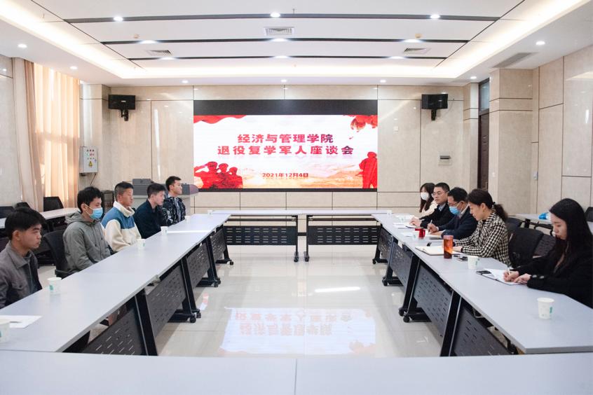 于教学楼B206召开退役复学军人座谈会。院党委书记牛青杨、党委副书记方芳、团委书记杨鑫、团委老师戚亚薇出席此次会议,各级退役复学军人积极到场参加。