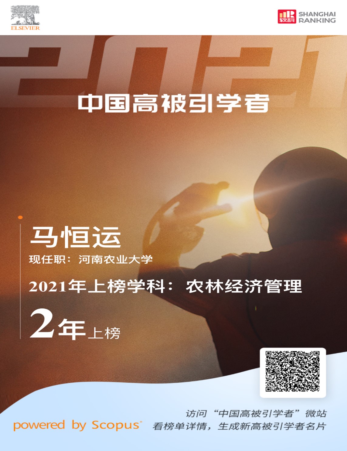 据悉,2021“中国高被引学者”上榜共计4701人,来自523所高校、企业及科研机构,覆盖教育部10个学科领域、84个一级学科。榜单以Scopus引文索引数据库作为中国学者科研成果的统计来源,采用上海软科教育信息咨询有限公司开发的方法,分析中国学者的科研成果表现。中国高被引学者从纯论文影响力的角度遴选学术人才,标准客观统一,有利于视角多元地看待人才,具有重要的参考价值。中国高被引学者一直是软科中国大学排名的核心评价指标。