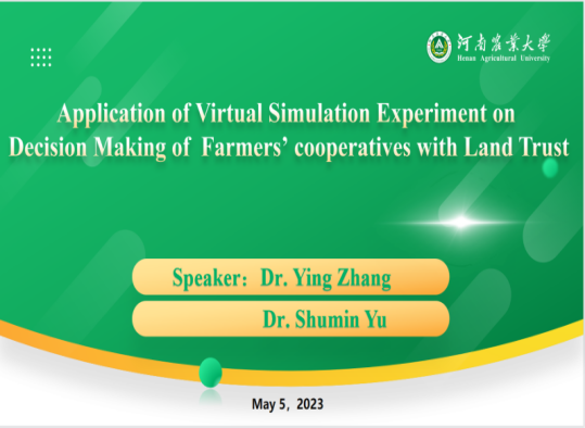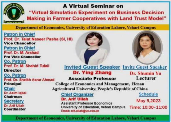 会议由拉合尔教育大学Arif Ullah博士主持,拉合尔教育大学Arif Ullah教授致辞。青年教师张颖博士做了题为“Application of Virtual Simulation Experiment on Decision Making of Farmers cooperatives with Land Trust”(土地托管类农民合作社经营决策虚拟仿真实验的应用)的主旨演讲,从实验设计、实验应用等几个方面介绍了该项目的建设情况,并在线进行了演示。该虚拟仿真实验是色色网站 教师主持的河南省高等教育教学改革研究与实践项目“农经专业核心课“理案讨虚实”五位一体教学模式研究与实践”(2021SJGLX094)以及河南省虚拟仿真实验重点项目的建设成果。