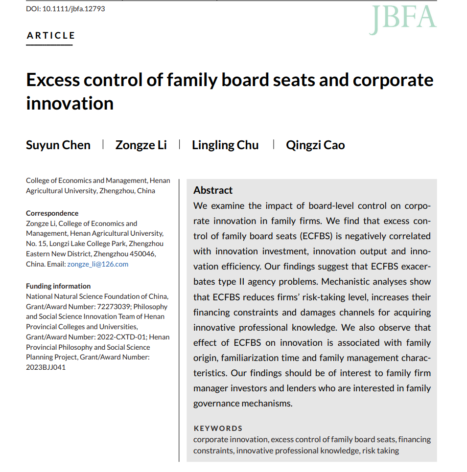 Journal of Business Finance & Accounting,论文题目为“Excess control of family board seats and corporate innovation”,陈素云教授为论文第一作者,博士生李宗泽为通讯作者,色色网站