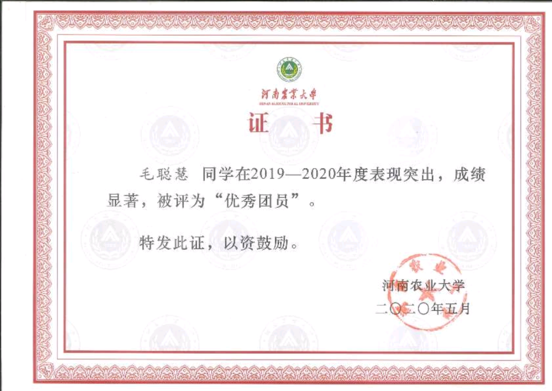 任职团支书期间,毛聪慧曾带领班级入党积极分子积极参与“五爱工程”建设,去到郑州市金水东路帮助执勤交警站岗,指挥路况,受到郑州市第六交警大队表彰。所在宿舍全员获国家励志奖学金,所带班级荣获校学风建设先进班级。除此之外,她在大一期间就带领班级同学获院“新生辩论赛”第二名,后来还带领他们积极参加学院举行的集体舞,红歌会等大型文艺活动,连续两年都进入了决赛并取得了较好的名次。作为一名团学干部,她带领班级同学去二七纪念馆了解郑州工人的革命历史。她也经常在班级内开展团日活动,帮助同学们了解我们党的最新时事和动态,通过代表发言,视频播放,舞台剧的形式将团日活动主题班会搞得绘声绘色,深受大家好评。任职记者团主任期间,她独立在校报发表文章两篇,负责组织协调记者团内部事务,联动推进校新媒体等六部门的日常工作。先后组织策划多次“元旦茶话会”“表彰大会”等大型校内外学生记者联谊活动,参加人数合计达到2000人。并获得“校优秀学生记者“荣誉称号。