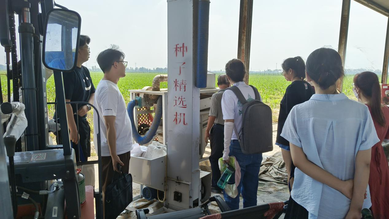 在山东德州市,实践团先后奔赴德州市陵城区宋家镇、徽王庄镇、神头镇开展调研,探究德州究竟怎样端牢“中国饭碗”。据了解,山东省德州市是全国首个“亩产过吨粮、总产过百亿”地级市,在全国率先整建制开展“吨半粮”生产能力建设。在工作人员的带领下,团队成员来到宋家镇粮食收购点,实地观察今年已收小麦情况。对比先前调研到的河南小麦情况,团队成员展开讨论。随后,团队来到山东鲁研作物育种基地,近距离观看了各类大型农业机械,目睹了试验地高水平机械化作业。