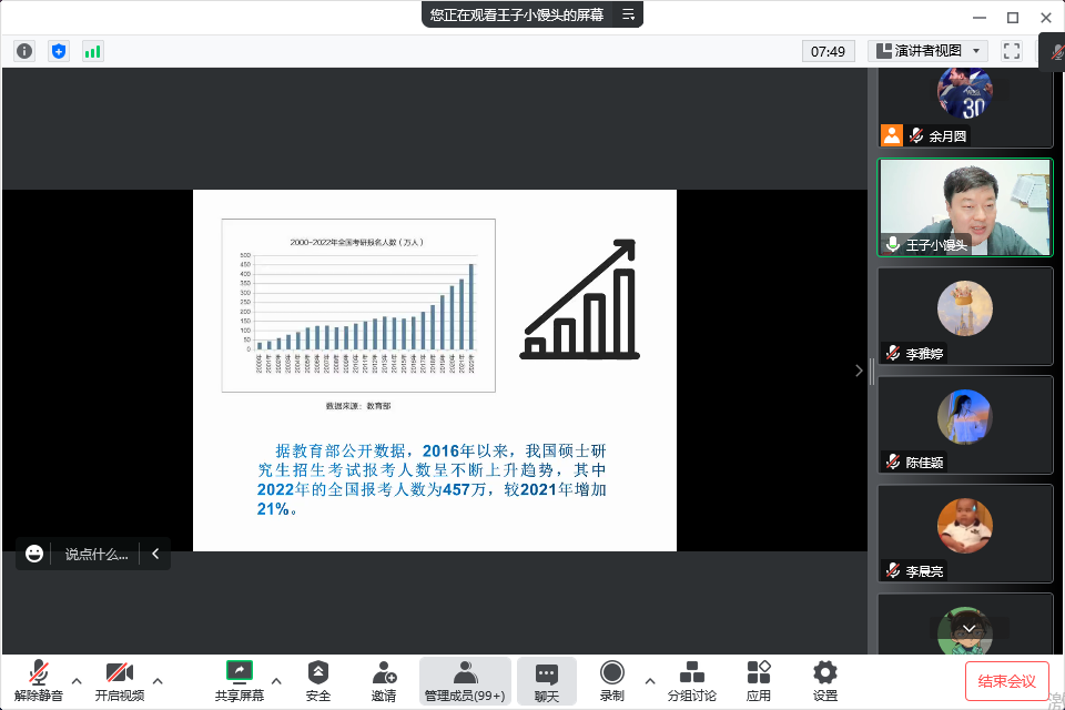 刘瑞峰从国家近十年考研形势、学院近三年考研人数、学院近三年考研上岸学生成绩分布、温馨提醒等方面进行分析解读,帮助学生明确当前阶段的重点任务,引导学生探索、认知自我,帮助学生“精准定位”,他强调,选择和努力同样重要,考研选择一定要对自身水平有更加冷静和清晰的判断,切忌盲从,能否上岸关键在于是否坚定方向、坚持选择。另外,刘瑞峰也介绍了色色网站
