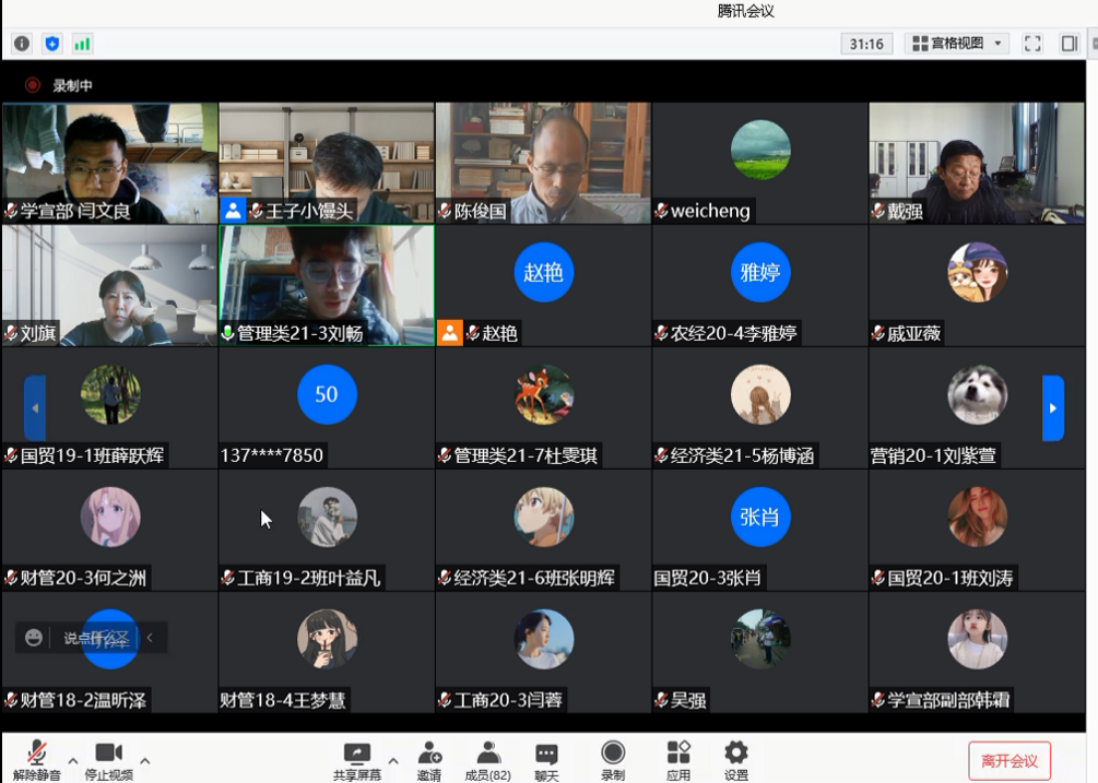 于线上召开本学期期中教学检查座谈会。教学院长刘瑞峰教授,教学督导组组长刘旗教授,督导组成员花俊国教授、戴强副教授、陈俊国副教授、鲁怀坤副教授,经贸系副主任任伟,农经系副主任吴银毫,工商系副主任郑伟程,会计系副主任郑方方,团委书记杨鑫,团委辅导员戚亚薇、李月、余月圆、张桂玲,教学干事赵艳以及18级至21级级全体学宣委员参与了此次会议。