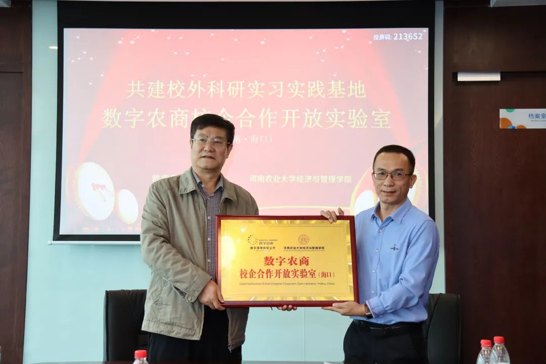 与数字海南有限公司(以下简称数字海南)校企合作签约仪式在数字海南公司正式举行。双方签订合作框架协议,并进行“数字农商校企合作开发实验室”授牌。双方将建立数字化农业战略合作关系,充分发挥自身优势,联合开展农业战略研究工作,实现优势互补、合作共赢。