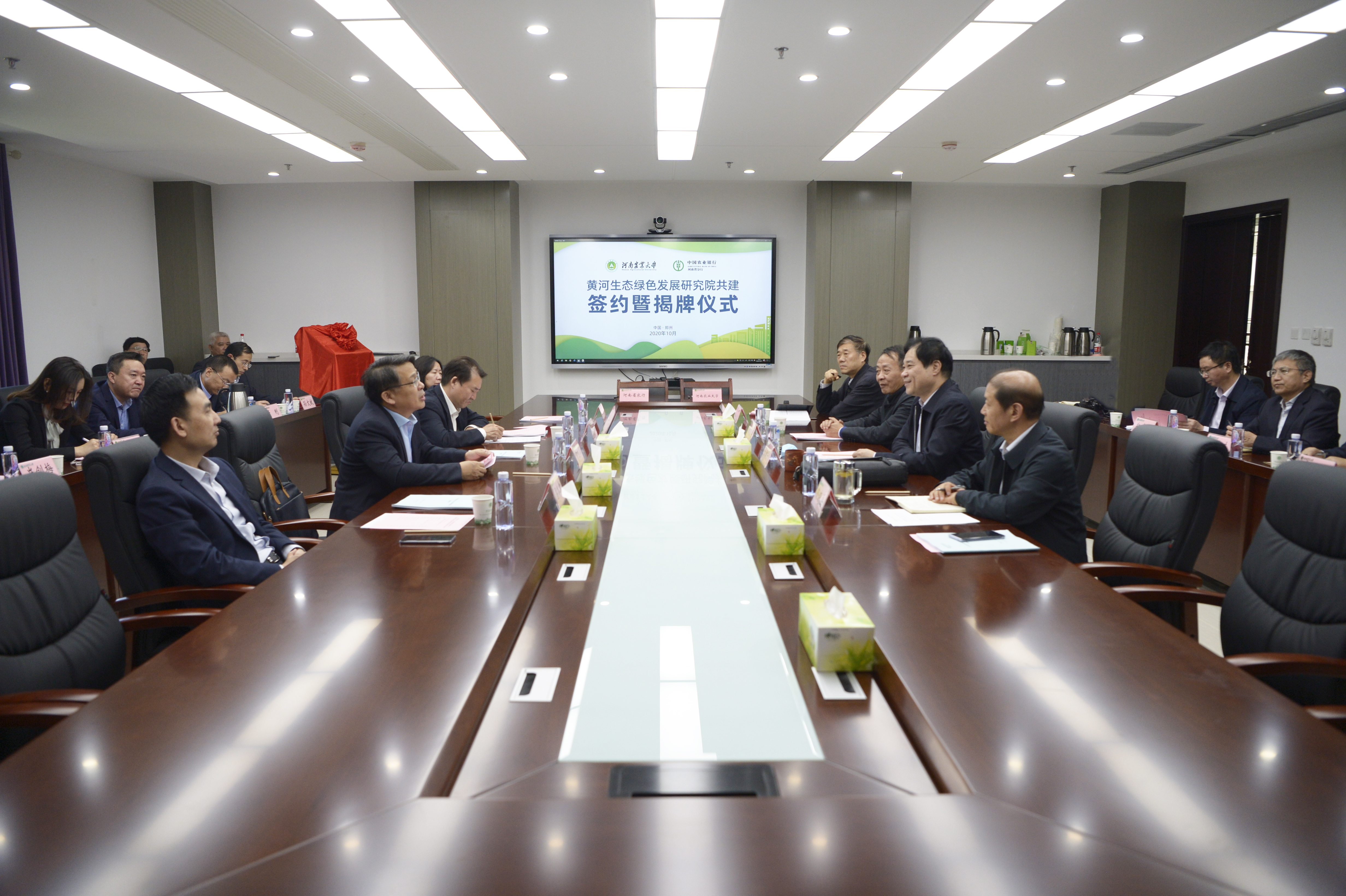 (通讯员:吴一平)10月21日下午,我校与中国农业银行河南省分行签约共建黄河生态绿色发展研究院,中国农业银行河南省分行党委书记、行长董玉华和校党委书记魏蒙关共同为黄河生态绿色发展研究院揭牌。中国农业银行河南省分行副行长赵予开、梁本录,我校校长、中国工程院院士张改平,校党委副书记、副校长介晓磊,副校长康相涛出席签约暨揭牌仪式。校办主任郑东方、校社会服务处处长贺德先、院党委书记牛青扬、院长马恒运和吴一平、唐华仓教授等列席仪式。