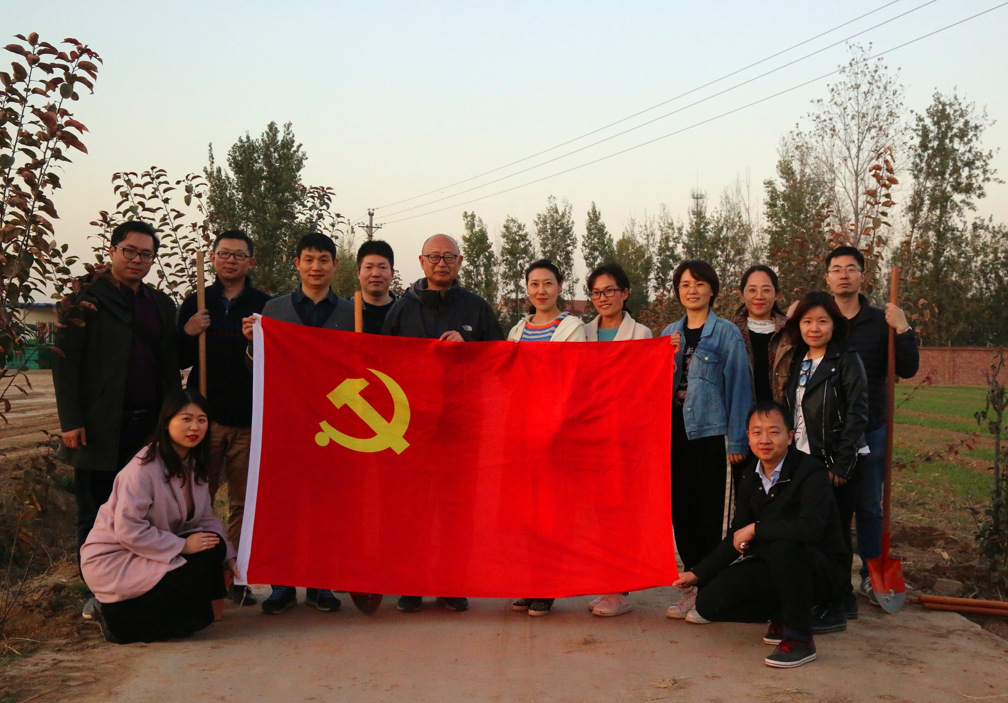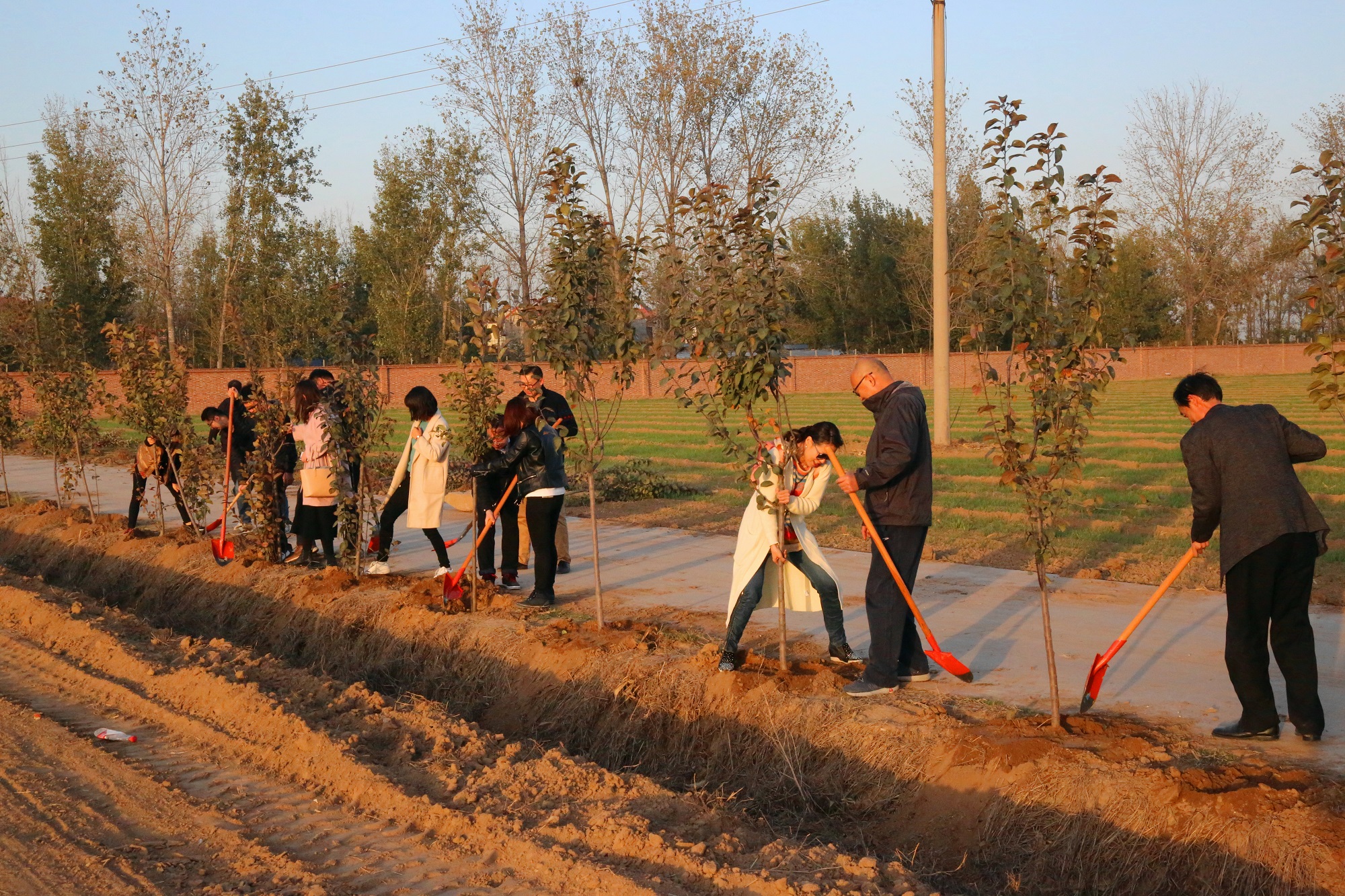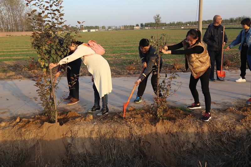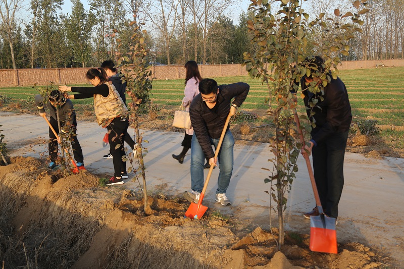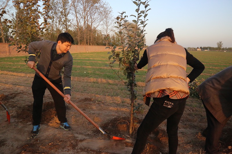 在植树现场,大家有的扶苗,有的培土,各个环节衔接有序,配合默契,真正是劲往一处使、汗往一处流,充分发扬了团结、互助、友爱的精神。经过近2个小时的挥汗奋战,66棵海棠树整齐的被栽种完毕,在初冬的阳光中播撒下绿色的希望,为园区增添了一片生机勃勃的绿色景象。