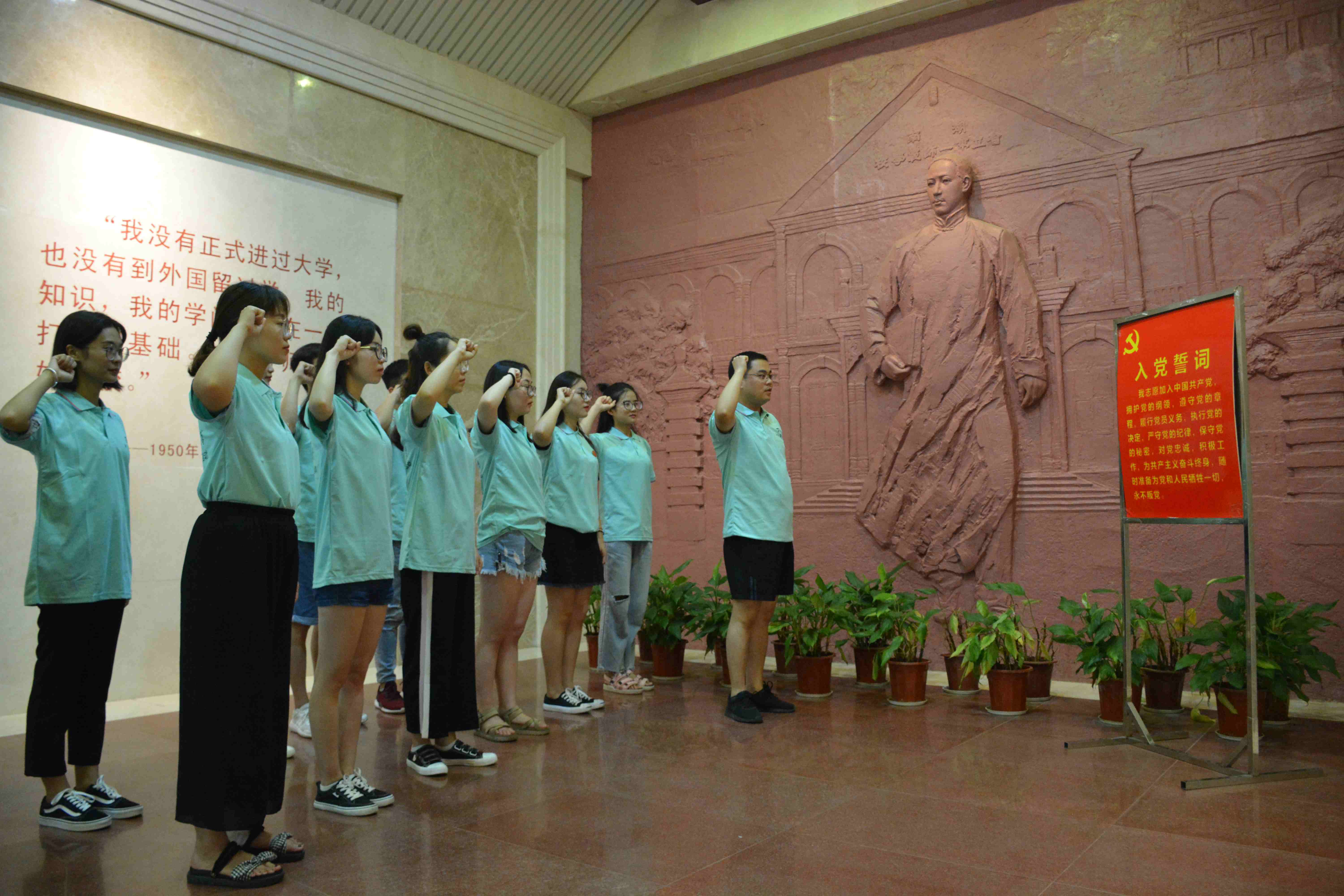 7月5日,团队抵达湖南省立第一师范学校旧址,开展以“沿伟人足迹,重温革命岁月”为主题的党员教育实践活动。在讲解员的讲解中队员们了解到,毛泽东曾在这里立下了“改造中国与世界”的宏伟志向,并完成了从学生、教员到职业革命家,从激进民主主义者到马克思主义者的转变。党员们在指导老师的带领下回顾了毛泽东在湖南省立第一师范的青少年时期,并在毛泽东浮雕像下向中国共产党庄严宣誓。午后,团队奔赴湖南省长沙市橘子洲景区,队员们在橘子洲头瞻仰毛主席青年时期雕像并与之合影留念。
