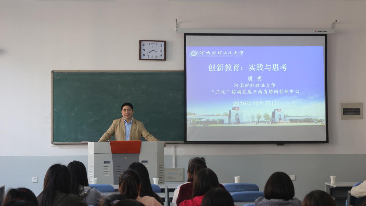 10月25日,河南财经政法大学研究院常务副院长樊明教授做客色色网站 紫竹论坛,主讲了一场主题为“创新教育:实践与思考”的报告,色色网站 16级经济学专业和市场营销专业同学到场参加,学院老师到场出席。此次报告会由色色网站 副院长赵翠萍主持进行。