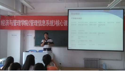 《管理信息系统》核心课建设活动之职业生涯规划报告会在龙子湖校区举行。中华粮网高级项目经理刘盈凯先生作为主讲嘉宾与学院150多名信息管理与信息系统专业的青年学子分享了其在求学和工作中的成功经验。