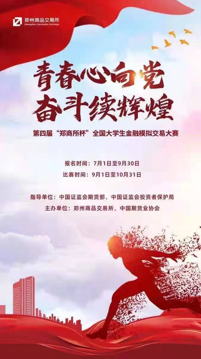 学生朋友们,郑州商品交易所为深入贯彻落实党的十九大和第五次全国金融工作会议精神,落实证监会与教育部联合发布的《关于加强证券期货知识普及教育的合作备忘录》部署,做好期货知识普及工作,适应新形势下期货市场发展对人才的需求,在证监会期货部、投保局指导下,我所联合中国期货业协会将于近期举办第四届“郑商所杯”全国大学生金融模拟交易大赛活动。经过我公司积极申请,郑州商品交易所已对我公司资格、资质予以审批通过,东兴期货有限公司获得承办开展我校金融模拟交易大赛的报名辅导工作,以及后续进行“期货知识知识进校园”活动资格,现将有关事项通知如下。