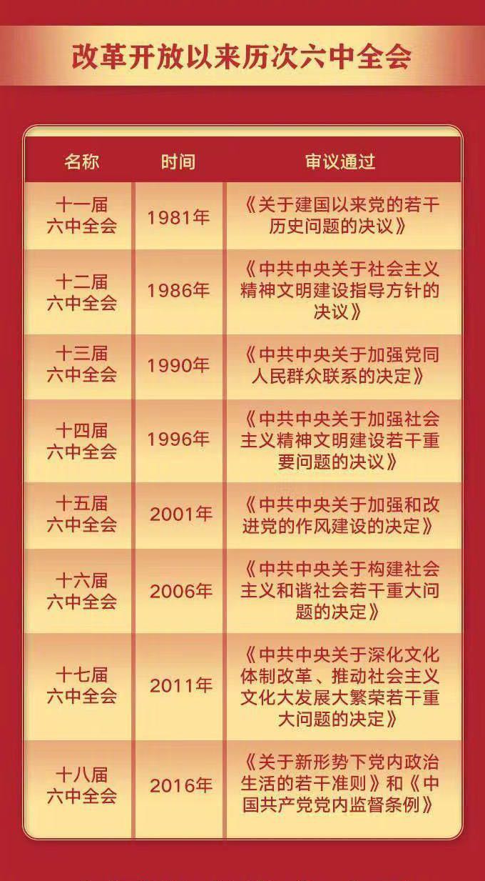 中国共产党第十九届中央委员会第六次全体会议于2021年11月8日至11日在北京举行。会议肯定了党在十九届五中全会以来中央政治局的工作,回顾了党的一百年奋斗历程,总结了党百年奋斗的历史意义,并决定中国共产党第二十次全国代表大会于2022年下半年在北京召开。十九届六中全会肯定当下,回顾历史,展望未来,这代表着中国共产党第一个一百年的完美谢幕以及下一个一百年的帷幕拉开。中国共产党始终坚定理想信念,牢记初心使命,谦虚谨慎,不骄不躁,艰苦奋斗,不为任何风险所惧,不为任何干扰所惑,始终坚持以马克思列宁主义、毛泽东思想、邓小平理论、“三个代表”重要思想、科学发展观、习近平新时代中国特色社会主义思想为指导。我们坚信,在过去一百年赢得了伟大胜利和荣光的中国共产党和中国人民,必将在新时代新征程上赢得更加伟大的胜利和荣光!