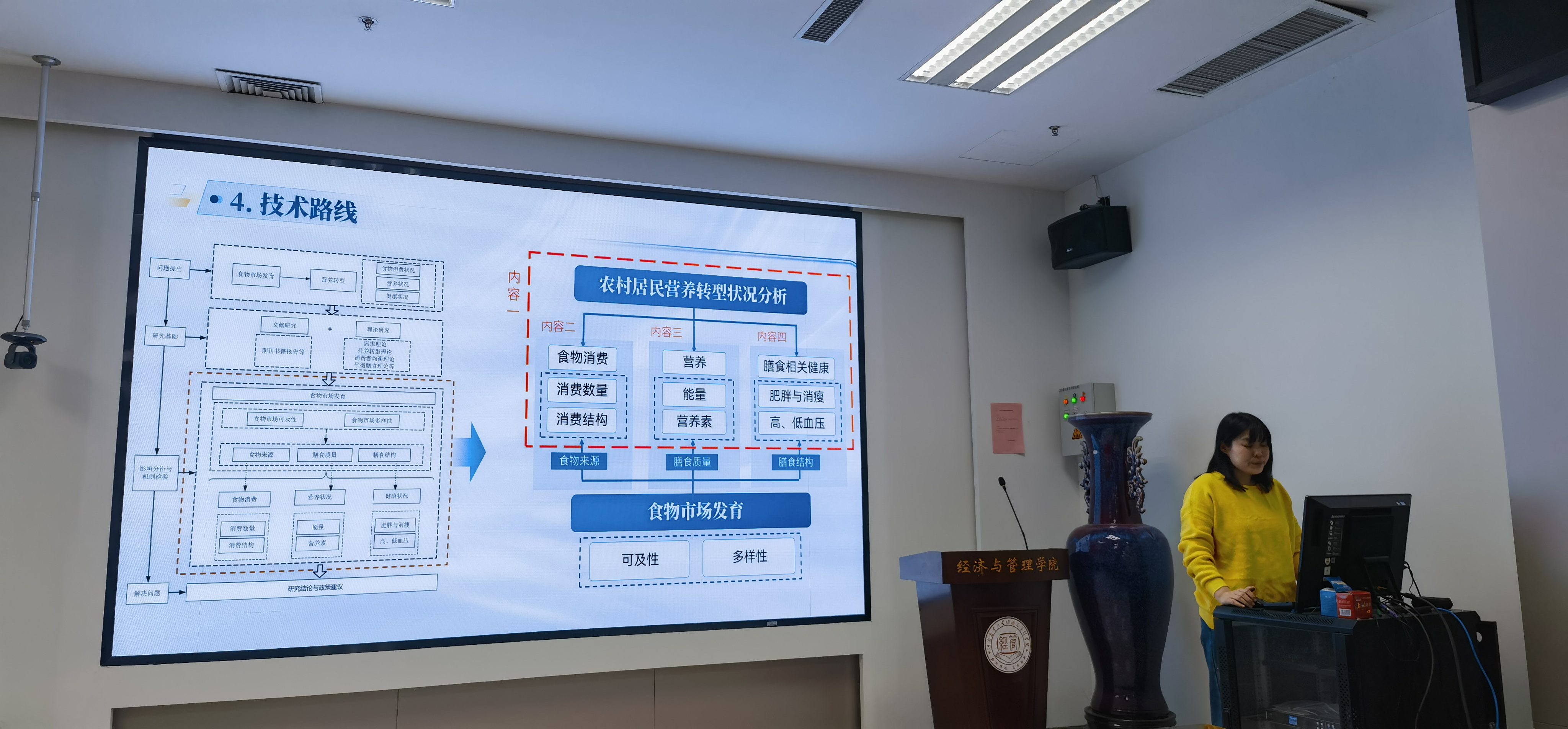 12月26日下午,南京农业大学周莹博士为学院师生作题为“食物市场发育对农村居民营养转型影响研究”的学术报告,内容包括选题背景与意义、研究内容、技术路线和研究结论等几个方面。
